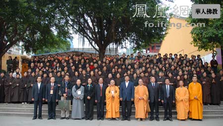 与寺院僧俗大众合影留念(图片来源:凤凰网华人佛教 摄影:梁龙腾)