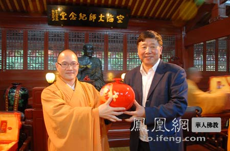本性法师向叶小文赠送瓷器(图片来源:凤凰网华人佛教 摄影:梁龙腾)