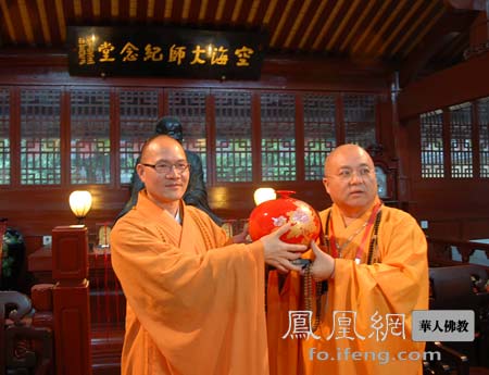 本性法师向果东大和尚赠送瓷瓶(图片来源:凤凰网华人佛教 摄影:梁龙腾)