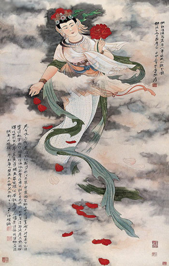 池春红的形象还屡屡出现在张大千的画中,如《清商怨》、《红拂女》(自题为“惊才绝艳”)、《美人双蝶图》等,或出以古代仕女,或出以仙佛人物,或出以摩登小姐。但以壁画之法——而且是敦煌行前的壁画之法——渲染描绘的恐怕只有这件《天女散花》。《天女散花》上的天女形容安详娴静,笔情墨韵跃然纸上,然而在兵荒马乱的战争时期,一位痴情女子的凄惨命运却让人嗟叹不已。(王宏伟)