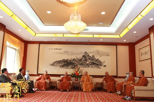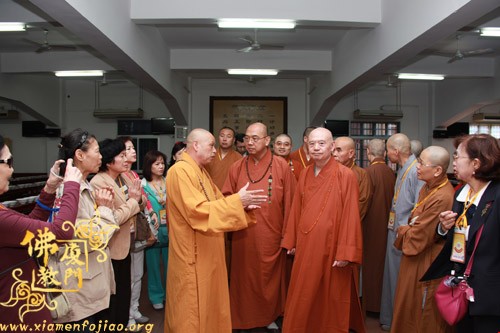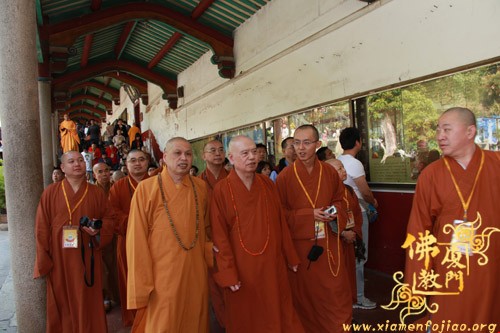 上午10时30分,厦门市佛教协会常务副会长定恒法师与南普陀寺知客戒舟法师等在天王殿前热情迎接了中长老一行的到来,并陪同参观大雄宝殿、大悲殿、斋堂、闽南佛学院等处。随后在南普陀寺普照楼座谈,宾主双方就南普陀寺、闽南佛学院及厦门佛教的发展现状和台北佛教界现况进行了友好交流。