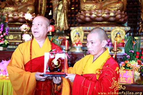 厦门市佛教协会副秘书长 太平岩寺住持世澄法师向法照大和尚赠送礼品