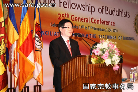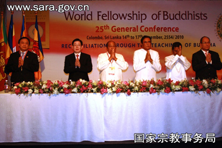 11月14日,应世界佛教徒联谊会主席瓦纳密提和本届大会组委会主席、全锡兰佛教会主席贾格特邀请,我局王作安局长出席了第25届世佛联大会并在开幕式上致辞。王作安说,世佛联作为全世界佛教徒增进友谊、加强团结、深化交流的重要平台,秉承“促进佛教徒严格实践佛陀的教义,加强佛教徒的紧密团结,促进世界和平与众生幸福”的宗旨,在联合各国佛教徒弘法利生方面发挥了积极作用。我们尊重世佛联所付出的努力,赞赏世佛联所取得的成就。 王作安指出,中国国家宗教局支持中国佛教界参与世佛联工作。以世佛联成立60周年为新的契机,以中国佛教代表团参加本届大会为新的开端,中国佛教界将在世佛联的平台上,加强同各国佛教界的交流交往,精诚团结、深化合作,共同为维护人类和平、世界和谐做出应有的贡献。本届世佛联大会的召开,必将进一步增进各国佛教徒的团结合作,共同履行佛教的社会责任,积极承担佛教的和平使命、共同谱写佛教事业的新篇章。 第25届大会于11月14日—17日在斯里兰卡首都科伦坡举行,来自世界各地佛教界的高僧大德和各界人士近600人参加了大会,中国佛教协会组成了70多人的中国佛教代表团出席了大会。斯里兰卡总理贾亚拉特纳出席了大会开幕式并致辞。会议期间还将举行世佛联成立60周年庆典活动。 世界佛教徒联谊会 (World Fellowship of Buddhists ,简称“世佛联”,WFB) 是在世界佛教界具有较大影响的国际性佛教组织之一,成立于1950年,首次大会在斯里兰卡举行。第一届大会确定的佛教教旗、教徽、佛诞节时间已为各国佛教界广泛认可。自其成立以来,对团结世界各国佛教徒,加强各国佛教界的友好交往发挥了重要和积极的作用。