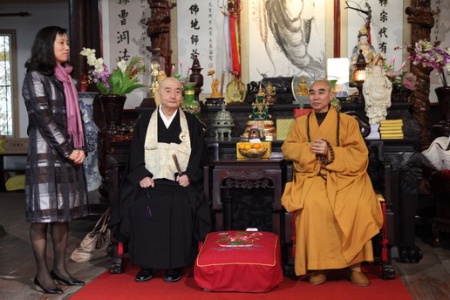 随后,不老阁福山贯首一行在修祥法师、德云法师、计艺法师、圆通法师、立法法师的陪同下,到方丈殿拜会了天童禅寺方丈诚信法师。诚信法师首先对不老阁福山贯首一行的到来表示热烈的欢迎,并互相回顾了天童禅寺与永平寺的历史渊源。