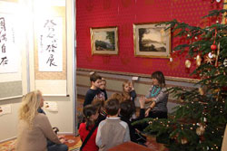 上午开幕式之后,接近中午时刻,参观一笔字画的当地人愈来愈多,其中来自东欧的民众比例不小,这也凸显了维也纳衔接中东欧门户的重要性。当三位小学老师带领著三组孩童进入展厅参观时,这为寒冷的冬季增添了些许活泼童稚的气息。原来,老师是要带着小朋友们前去参观于展馆内的圣诞树,却惊喜的发现一笔字画展,于是,趁此机会为小朋友解释中国书法之美。
