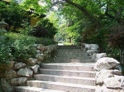 拾阶而上,穿院落,行数百步,岚辉映合,林木杂迷,山草茂密。逾弯西折,便见一院门,素雅俨丽,原来是迦陵讲院到了。