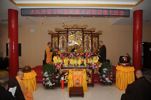 时逢阿弥陀佛圣诞,2010年12月15日大庆市净觉寺恭请台湾净律寺良因法师主法举行精进佛七共修法会。早5:00起七,并于早斋后传授七天八关斋戒(随喜)。