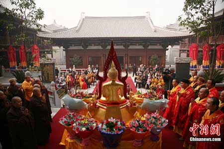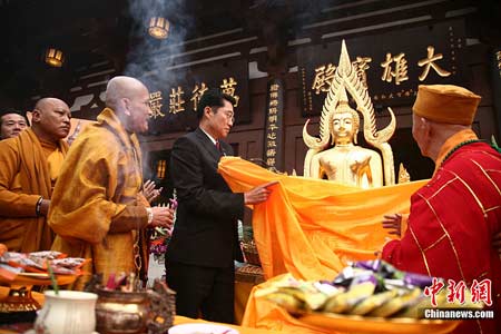 成都应天寺首次供奉泰国公主诗琳通赠送的沁那拉佛现场。(图片来源:中国新闻网 摄影:张浪)