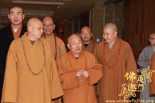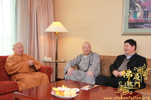 中国佛教协会副会长、闽南佛学院院长、南普陀寺法主圣辉大和尚,中国佛教协会常务理事、厦门市佛教协会会长、南普陀寺方丈则悟大和尚,中国佛教协会常务理事、厦门市佛教协会常务副会长定恒法师,中国佛教协会理事、厦门市佛教协会副会长、闽院副院长法源法师,厦门市佛教协会副会长法云法师、秘书长净心法师,新加坡龙山寺、厦门普光寺住持传健法师等在酒店热情迎接传印长老一行并亲切交谈。