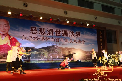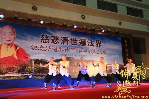 随后,由闽南佛学院学僧自导自演的“仰止怀恩”精彩文艺节目隆重上演,有诗朗诵《圆月耀天心——忆妙湛老和尚》、有精湛的武术表演《中华功夫》、歌曲《和你一样》、小品《昨天、今天、明天》、舞蹈《出坡》、散文《承担》、印度舞《显现》、小品《拍卖》、舞台剧《阿育王》、大合唱《闽院院歌》等。