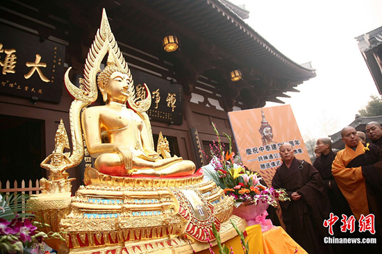 2010年12月22日,“泰国诗琳通公主赠送佛像”仪式在四川省成都市双流县应天寺举行。泰国公主诗琳通此次赠送的泰国素可泰式法拓沁那拉佛(释迦牟尼佛)共8尊,全身为黄铜铸造,表面贴金,于2010年10月3日在泰国曼谷铸造而成。铸佛仪式由泰国父僧王主持。这8尊佛像将通过四川省佛教协会转送给成都应天寺、峨眉山寺院、成都大慈寺、北川龙吟寺等八座寺院。图为成都应天寺首次供奉赠送的沁那拉佛现场。(图:张浪)