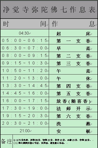 (一) 75分内容:拜佛20分,绕佛15分,坐念15分,止静15分,念佛10分。