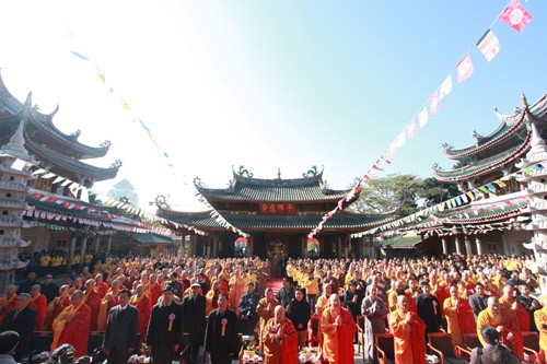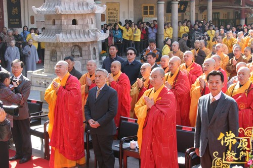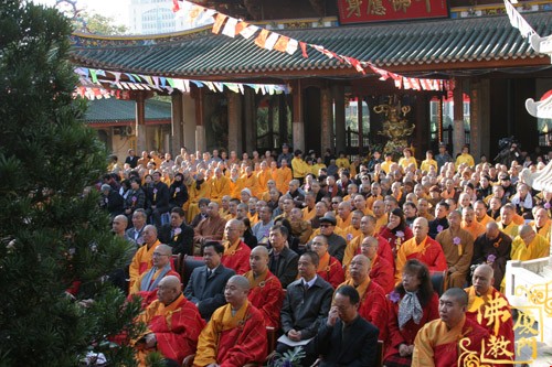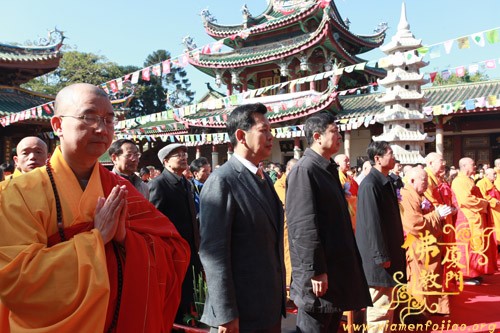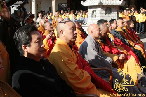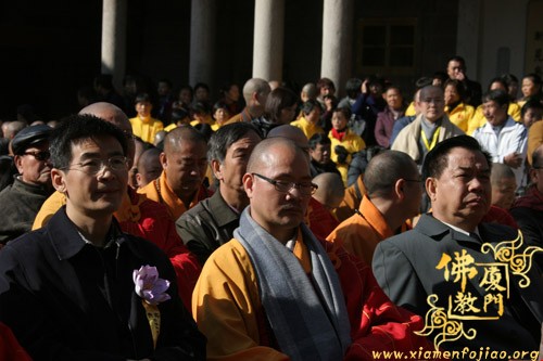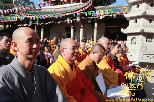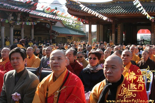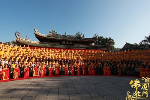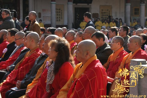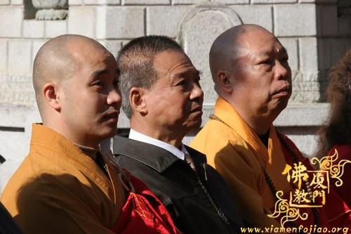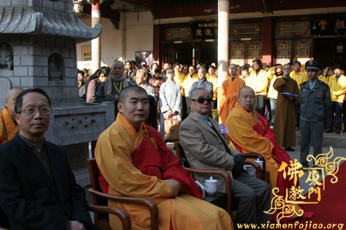 今天上午8时许,与会嘉宾在南普陀寺天王殿前合影留念。8时30分,钟鼓齐鸣,与会嘉宾云集在南普陀寺大雄宝殿前隆重举行纪念妙湛老和尚百年诞辰追思法会开幕式,开幕式由南普陀寺基金会正兴法师主持。