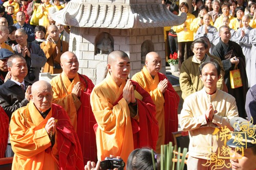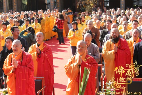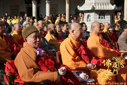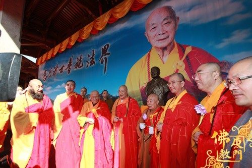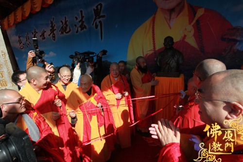 上午10时许,由传印长老、圣辉大和尚、学诚大和尚、梦参长老、宽运大和尚、湛如法师、印顺法师、净雄法师、普法法师、道元法师、本性法师、赵雄法师为妙湛和尚铜像揭幕。由