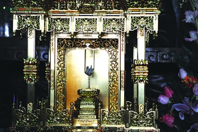 这座供奉宝塔高138厘米,长宽均为68厘米,通体金光灿灿,布满复杂的纹饰,显得流光溢彩、富丽堂皇。宝塔的上部为镂空雕刻六角亭,意为“六和”。琉璃瓦的大屋顶,四周为六角垂铃,下面是可以自由开启的六栅双门,屋顶上面为玲珑剔透的宝顶珠。亭子由六根荷花祥云包裹的金色立柱支撑,显得既有仿古造型,又不失现代华丽。