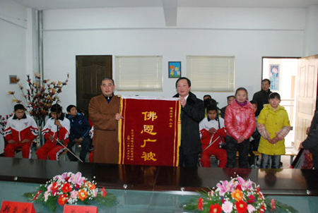 特殊教育学校的校长向常勇法师赠送“佛恩广被”锦旗