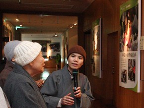 在环保展的海报前,妙境长老一行观看了环保志工们如何用双手净化地球的图片展。“何谓慈济纱?慈济人员发挥智慧,环保志工牺牲奉献,才能成就今日的赈灾毛毯与慈济纺织品。”当法师们亲手触摸到真品的慈济纱,不能置信地的说:“真的是化腐朽为神奇。”