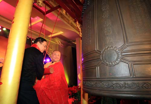 觉醒大和尚代表上海玉佛寺向2000户特困家庭捐赠迎新帮困款 台湾歌星姜育恒献唱 觉醒大和尚与冯国勤一起,敲响迎新第一钟声,祝福上海。 12月31日晚,2011年“祝福上海――上海社会各界迎新年慈善晚会”在此间名刹玉佛禅寺举行。上海市政协主席、市慈善基金会理事长冯国勤先生,市慈善基金会名誉理事长陈铁迪女士,上海市委常委、市委组织部长沈红光先生,市委宣传部副部长、市文明办主任马春雷先生,市民宗委党组书记周富长先生、市民宗委副主任王君力先生,普陀区人民政府副区长符祖鸣先生,中国佛教协会副会长、市佛教协会会长、玉佛寺方丈觉醒大和尚以及上海社会各界的群众及玉佛寺本寺的僧职员工和护法居士600余人出席。 此次以“祝福上海”为主题迎新晚会,特邀港台及大陆知名艺人姜育恒、焦晃、方琼、张行等与玉佛寺梵乐团同台演出,以歌舞、梵乐、演唱、小品、魔术、诗朗诵等形式,营造喜庆、祥和、欢乐、祝福的氛围,反映包括佛门弟子在内的广大上海人民关注上海、热爱上海、祝福新年的美好愿望,表达社会各界人士对人心和睦、社会和谐、世界和美、同浴蓝天、共享至爱的和谐世界的渴求与向往。 在晚会现场,觉醒大和尚代表上海玉佛寺向2000户特困家庭捐赠迎新帮困款,同时,觉醒大和尚还发表了热情洋溢的新年祝辞。晚会结束后,寺院举行了一系列富有佛教特色的迎新撞钟、祈福活动。 “祝福上海―上海社会各界迎新年慈善晚会”是上海每年年末的固定迎新项目,迄今已经成功举办了五届。今年的第六届迎新慈善晚会由玉佛寺联合上海市慈善基金会、市精神文明建设委员会办公室、市红十字会、市残疾人联合会、市老年基金会、市广播电视台和上海文化发展基金会共同主办,并得到上海市文化广播影视管理局、上海市民政局、上海市普陀区人民政府等的支持,由上海玉佛禅寺、艺术人文频道和上海广电影视制作有限公司承办。(摄影:潘索菲)
