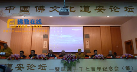 2011年1月15日,以“般若道安,智慧襄阳”为主题的中国佛文化道安论坛暨释道安诞辰1700年纪念会(筹)在中国佛学院隆重举行。此次活动受到了中国佛教协会名誉会长一诚长老、会长传印长老及秘书长王健等领导的亲自关怀和大力支持,由中国佛教图书文物馆、中国佛教文化研究所和全国科管委文化产业管理专业委员会、北京大学传统文化与现代管理研究中心、湖北省佛教协会、湖北省襄阳市佛教协会等共同组织。全国政协原副主席王文元、中国佛教协会名誉会长一诚长老、中国佛教协会秘书长王健,襄阳市委常委、市委统战部部长刘德正等襄阳市相关领导出席。来自湖北襄阳及北京、重庆、海南、杭州、深圳等地的诸山长老及中国人民大学等所属宗教研究机构的专家学者、相关人士共200余人参加。此次论坛由中国佛教图书文物馆馆长圆持法师主持。
