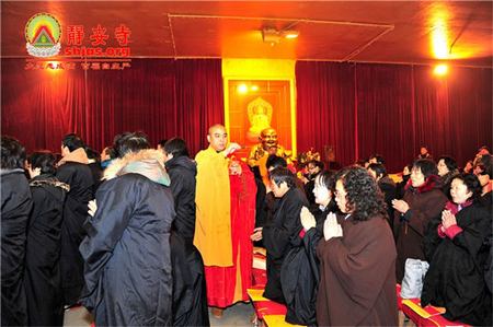 2011年1月11日(农历十二月初八),上海静安寺举行了庄严殊胜的皈依三宝法师,静安寺方丈慧明法师为206位发心学佛的居家二众正授皈依。