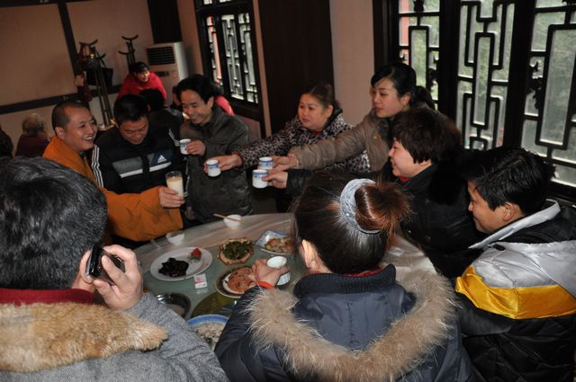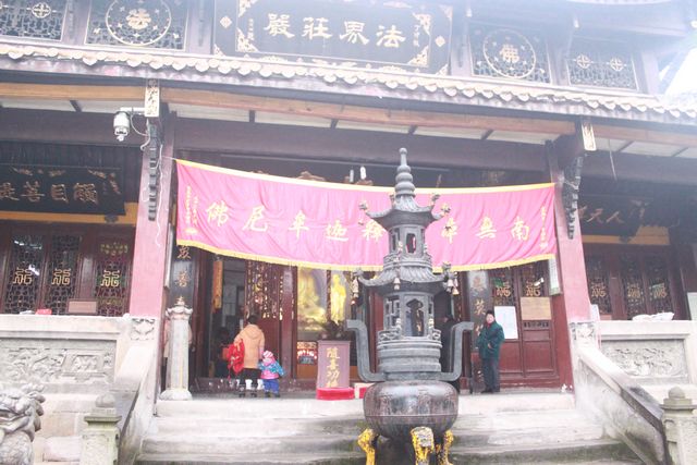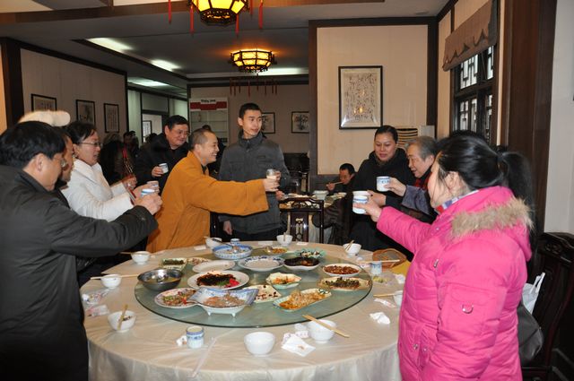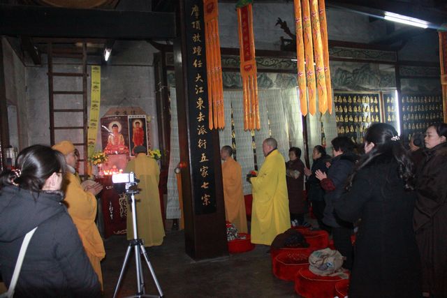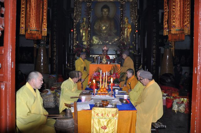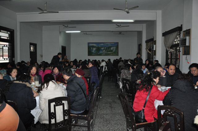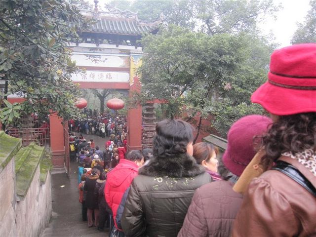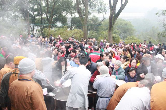 早晨六时,天空还下着小雨,就已经有市民陆续来到重庆华岩寺小山门,等待喝腊八粥的市民早已经排起了近200米的长龙。在施粥点,三口大木桶装着热气腾腾的腊八粥、10多名重庆佛学院的学僧忙着为市民们分发腊八粥,还组织了近百名义工参与维持秩序、腊八粥的运送等工作。同时,数百名四众弟子在大雄宝殿举行祈福法会。寺院僧众虔诚恭念本师释迦牟尼佛佛号,共同祈愿佛日增辉、正法久驻,世界和平、国泰民安、众生解脱。