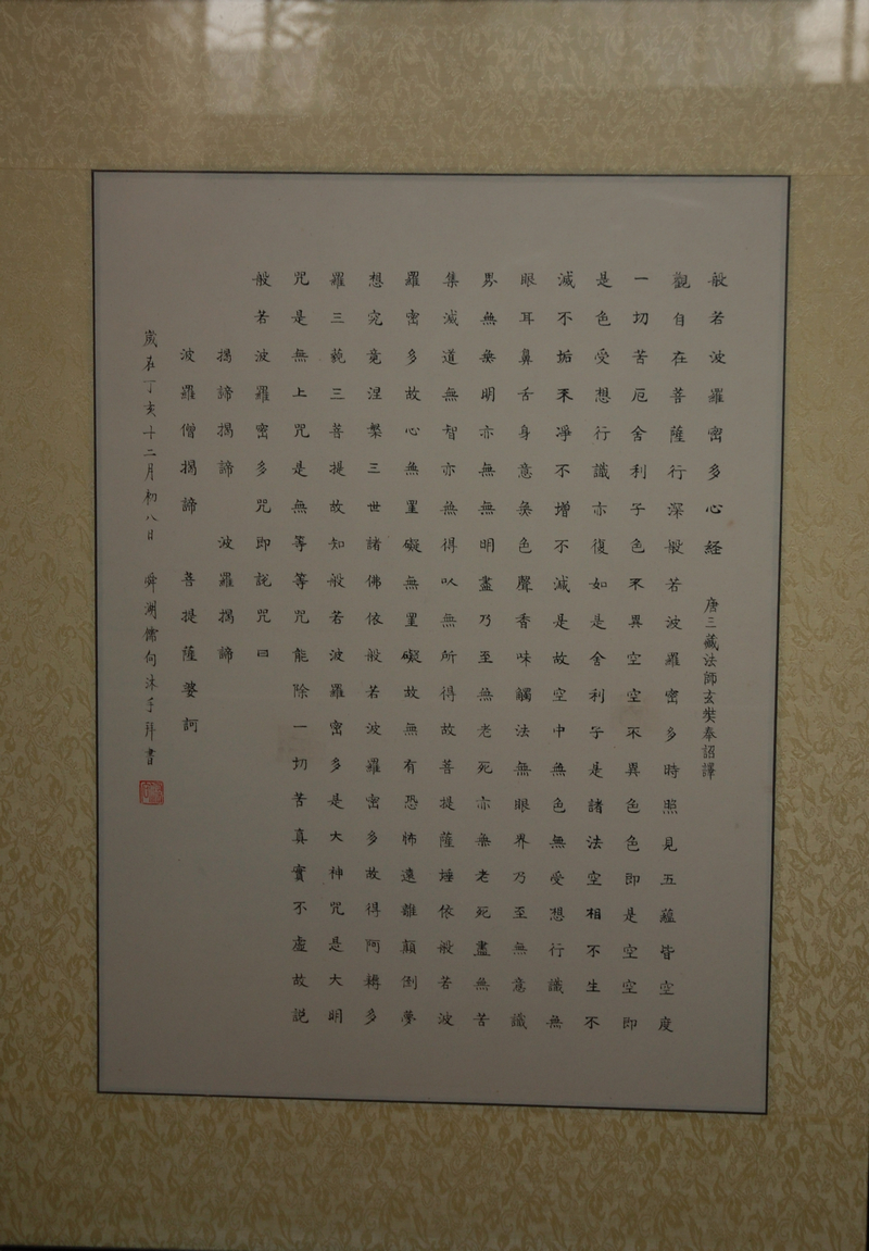 前年我的松陵学佛同修王海娟来看望我时带来了2007年我委托她先生杨先生为我写的一幅《心经》,杨先生是从松陵博物馆退休的,他也是一位虔诚的佛教徒。