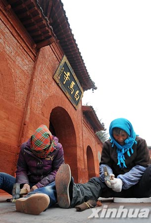 两名工人在清理白马寺门前广场地面(图片来源:新华网 摄影:王颂)