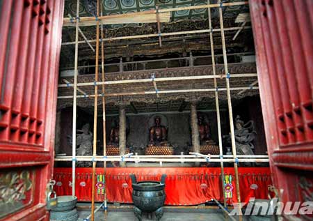 2011年2月21日,白马寺大雄宝殿内已经搭起了脚手架,准备进行修缮(图片来源:新华网 摄影:王颂)