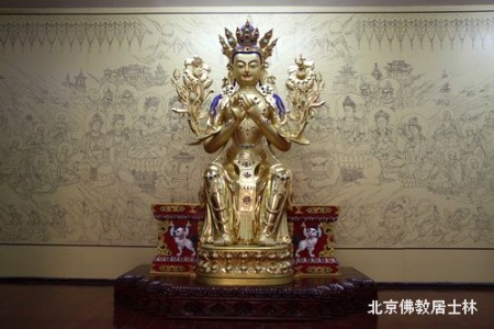 近日,北京佛教居士林从青海塔尔寺迎请回一尊弥勒菩萨像。2011年2月2日(农历正月初一)值弥勒菩萨圣诞日,北京佛教居士林的众多居士积极参与和承担了弥勒殿的建设、装饰工作。北京佛教居士林特意礼请了有“佛像王”之称的根桑法师(王惕)为弥勒殿创作了壁画“弥勒说法图”,并由根桑法师指导弥勒菩萨的宝冠和璎珞镶嵌宝石的工作。