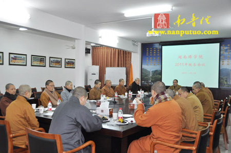 2011年2月16日上午8时30分,福建厦门闽南佛学院2011年新学期院务会议在南普陀寺慈善会二楼闽南佛学院会议室召开,由常务副院长界象法师主持。副院长法源法师、院长助理兼教务长传明法师、院长助理兼办公室主任净心法师、教导长达源法师、副教务长中观法师、办公室副主任界淞法师、办公室副主任悟源法师、副教导长超波法师、教务主任静安法师以及学院男女部各班主任参加此次会议。