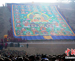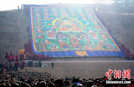 有着300余年历史的甘肃拉卜楞寺于2011年2月15日举行一年一度的正月十三晒佛节,今年展出的是西方极乐世界佛——阿米塔巴佛祖,上万僧众瞻仰了这一佛像。