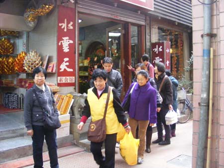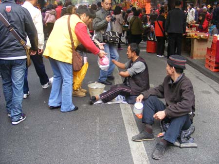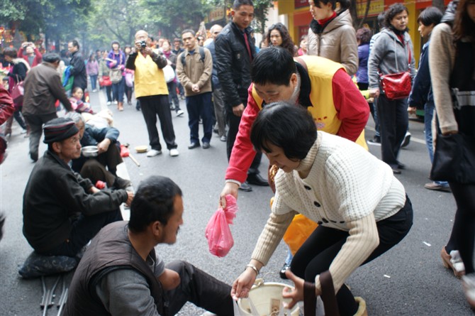由于不少师兄是第一次参与这次活动,可以说既兴奋,又有些新鲜感。我与黄师兄等十多位志愿者走的是光孝路这条街,这条街约有两百米长,由于今天祈福的人多,街上人流如潮,所有店铺多在做生意,尤其是卖香的店铺,生意十分火爆。而不知从哪些地方赶来的流浪者,走不了三两步,就可以碰到一个,无须寻觅。