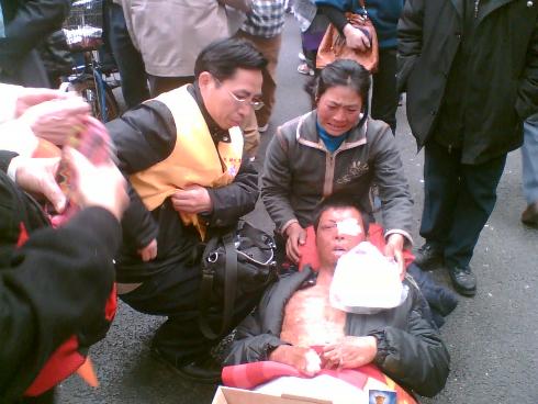 我们再往前走没多远,见到一位妇女,推着一位残疾人,大概是她的先生。这人仰着平躺在自制的木板车上,脸部由于残疾有些变形,双手手指也有残疾,胸腹部满是创伤,袒露着,没有覆盖什么衣服。我们见状后赶紧过去,可我们手边只剩一盒饭了,其他师兄们带的饭也全派完了。我只好将唯一的这盒饭交给这位推车的阿姨,并蹲下身体,关切地在她跟前说:“阿姨,过节了,我们送一盒饭给你们吃,你要多念阿弥陀佛,念佛可以改变命运的,愿你们越来越好!”这位阿姨接过我们送的饭,“哇”地哭起来,哭得非常伤心,我的眼泪几乎跟着她在同一时间“刷”地掉下来。我轻轻抚摸着这位大哥袒露着的胸腹部位,默默地为他祈福,并掏出在素食馆集合时一位师兄派发给我的红包,也不知里面有多少钱,投入到了这一对苦难人的乞讨箱中,我的眼里已满含泪水。