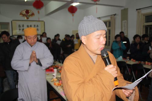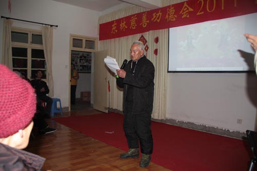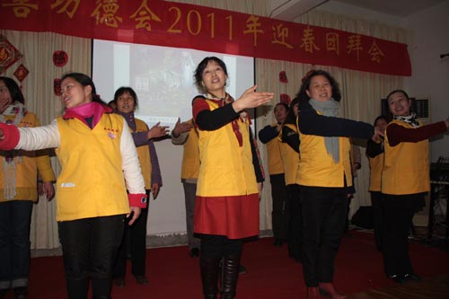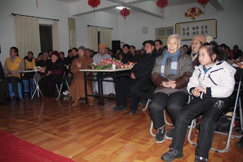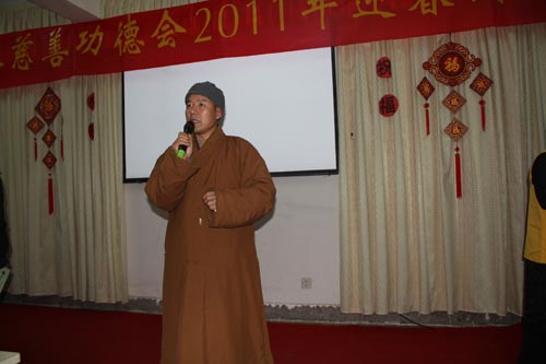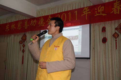 东林慈善功德会2011年新春团拜会散记 2011年元月23日晚,东林慈善功德会2011年新春团拜会在新春即至的浓郁喜庆氛围里召开了。当晚,功德会会长上镜下义法师、安养院老人、功德会全体工作人员与九江当地志愿者70余人欢聚一堂,共迎新春。 镜义法师首先对功德会一年来的工作做了总结,对功德会工作人员和全国各地志愿者一年来的辛勤工作和无私奉献表示了嘉许和随喜。随后,镜义法师围绕菩提心这一主题对与会者作了精辟地开示。他强调指出:菩提心是一切修法的核心。作为净土行人,不能只是关注个人的往生问题,更要发大心救度一切如母有情,让他们都对佛法生信,临终自在往生弥陀净土。法师的开示振聋发聩,引起了与会者的极大共鸣。 随后,镜义法师带领功德会全体工作人员上台集体读诵《新年贺词》,共同祈愿在新的一年里国家繁荣昌盛,人民安乐吉祥。