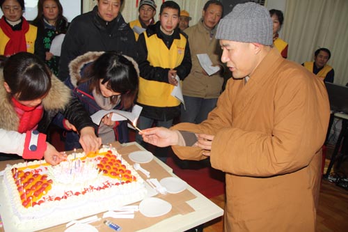 与会者为生日在近期的志愿者和工作人员集体庆生。镜义法师亲自切蛋糕,并把蛋糕送到每一位“寿星”的手上。