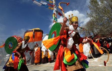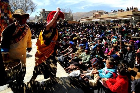 2011年3月19日(藏历年1月15日),为期半个月的藏历新年结束。西藏山南贡嘎县贡嘎曲德寺按照传统,举行展佛法会,僧人们表演传统宗教舞蹈——阿羌姆(即背鼓跳神),以示祈愿众生平安。寺庙僧人还向信众抛撒被加持的熟饭粒,以示赐福。据了解,曲德寺是藏传佛教萨迦派寺庙,该寺的阿羌姆有500多年的历史,传承至今。(文:觉果)