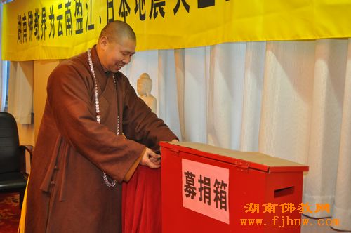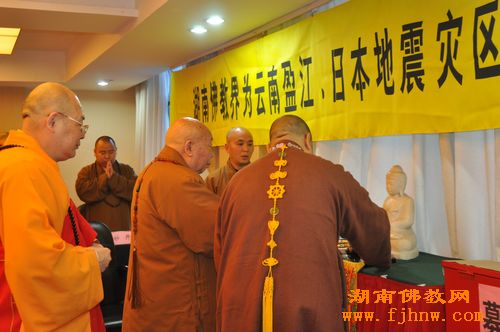 会上,中国佛教协会副会长、湖南省佛教协会会长圣辉大和尚带领全省各地区佛协主要负责人、省佛协常务理事及四众弟子为云南盈江、日本地震灾区亡者超度生者祈福诵经。会上,圣辉大和尚号召全体参会人员,当场为云南盈江、日本地震灾区捐助救灾善款43万余元。