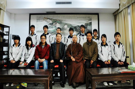 在福严寺方丈楼,大岳法师给学生们作了精彩开示,他详细解读了传授给学生们的“知足、包容、感恩”六字箴言。