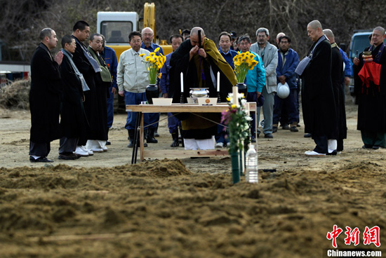 日本僧侣为集体埋葬的遇难者祈祷(图)