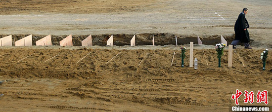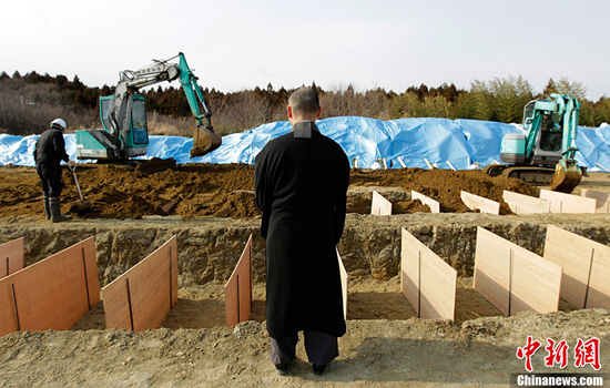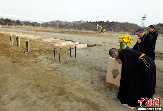 2011年3月22日,日本宫城县东松岛市集中埋葬多名遇难者,日本僧侣在葬礼现场为遇难者祈祷。