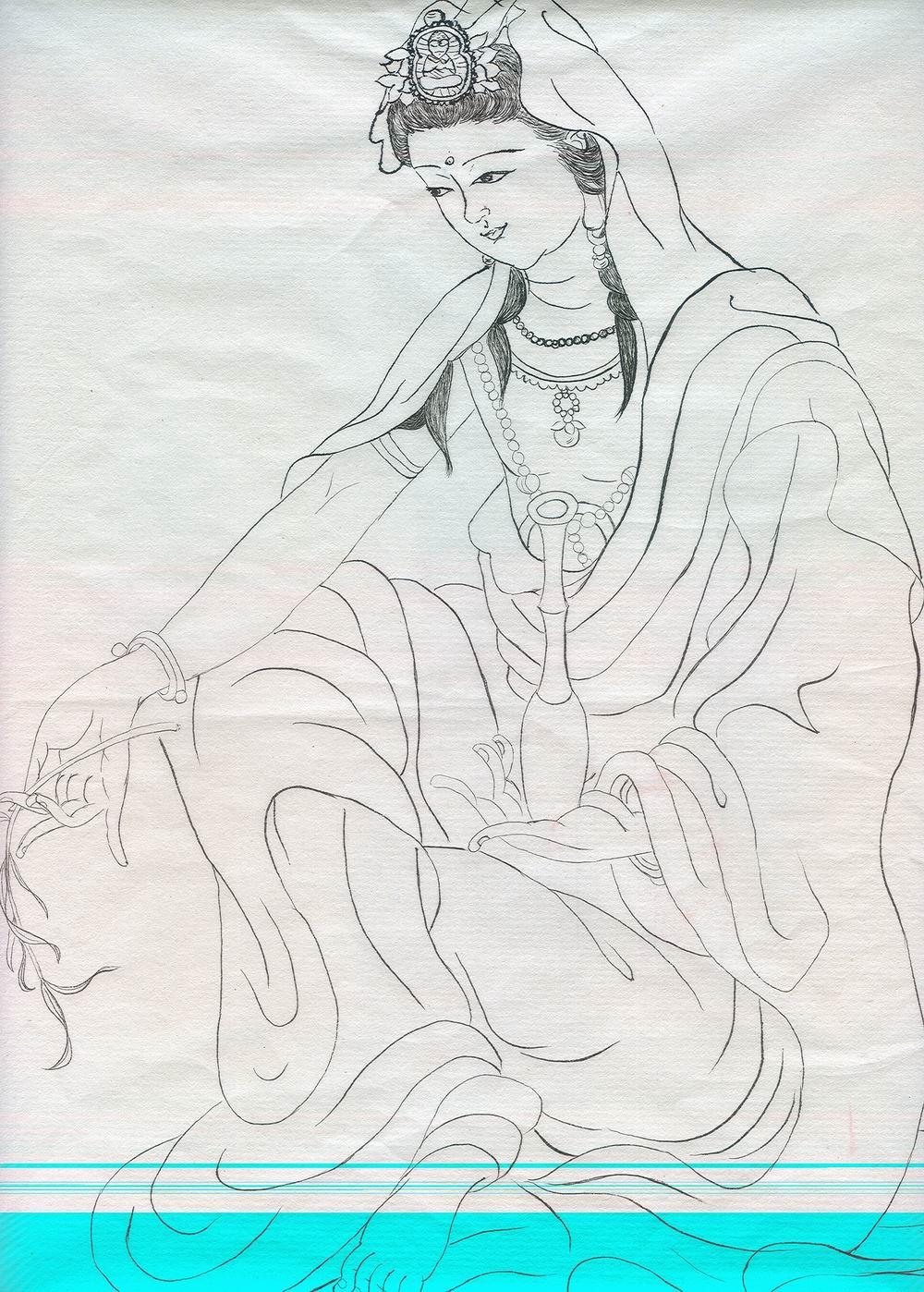 第一次画观音图,一开始战战兢兢,想把恭敬、观音的柔美、印象、内心的感觉表现出来,一方面担心,哪怕一条线条出错,出现繁冗、呆板等错误。