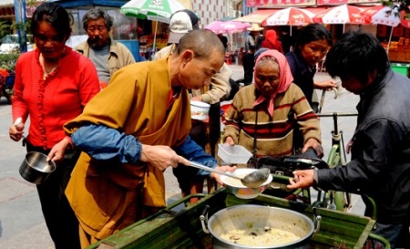 施粥的法演法师:粮食都很珍贵 该给需要的人