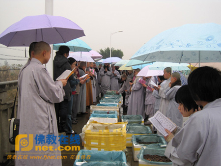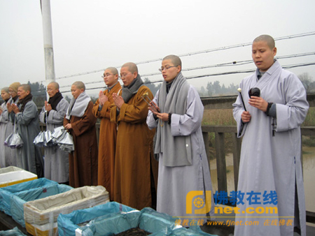 诠惠法师率学僧及信众们虔诚为水族说法、加持