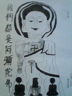 这是台湾大安国小六年级小朋友刘容君画的阿弥陀佛佛像,下面是其本人讲述的画阿弥陀佛的感受情况: