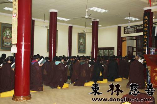 师父开示说:今天大家能同聚东林寺,共修普贤行愿,这是难得的机缘。普贤菩萨第一大愿礼敬诸佛,不光是礼敬我们佛堂大殿里所供的佛,而是要礼敬十方一切诸佛,包含过去,现在及未来的一切佛。究竟的来说,一切的众生都是佛,都要恭敬,大家要扩大心量,只有心量打开了,才能与诸佛菩萨的心感应道交,得以加被。无论对待父母、家人、朋友、同事、一切善人恶人,都要用一个真诚清净平等恭敬心来对待,这是普贤行。除了人,也要用真诚心、清净心、平等心、恭敬心对待一切万物。我们东林慈善的成员,要发大心,要把修行落在实处,要以普贤行愿为行为指南,这样我们的福德智慧才会圆满,业障消除,智慧显现。大家都认真的聆听镜义法师的开示,法喜充满。