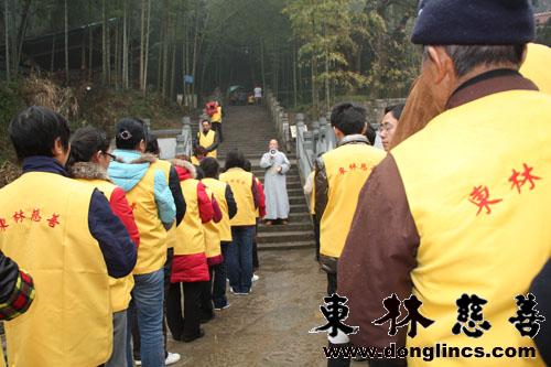 下午一点半,大家按时在四号楼集合,统一身着东林慈善的黄马甲,举行今天另一项共修活动——礼拜文佛塔。可下了一上午的细雨没有停下来,反而越下越大,师兄们正在讨论着如何是好,从四号楼到文佛塔有几百级台阶,石阶上满是水痕,天空也罩着雨雾,透着寒冷,大家默默祈祷期望活动开始时,雨能停下来,有几位师兄却欢喜的喊着:“没事没事,观音菩萨撒甘露,这雨水就是甘露啦. 呵呵”...大家顿时轻松起来,功德会的工作人员买来的雨衣给年长的居士们穿上,以免着凉。人员到齐,列队以待。镜义师父身着一件灰色的单薄僧衣来到了队伍的最前头,斑驳的水渍浸湿了衣服,显得更加单薄。师父拿起扩音器给大家做简单开示,今天我们礼拜文佛塔,大家要以至诚心,恭敬心,虽然天空下起了小雨,给我们带来了小小的阻碍,但我们这颗求道的心,成就的心,要坚固,不可因为外界的障碍干扰就退失了,我们要迎难而上,勇往直前。想想历代祖师大德,他们为了求法,为了利益众生,不惜抛头颅洒热血,布施自己的生命。想想玄奘法师,当年西去求法,遭遇种种磨难,心念依旧坚固,菩提心依然不退失,这是祖师们的精神,我们应当学习继承。今天虽然在下雨,就算是下雪,下冰雹,哪怕是下刀子,也要毫不退失,我们学佛就是要有这样的真心才行。