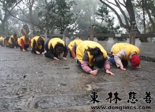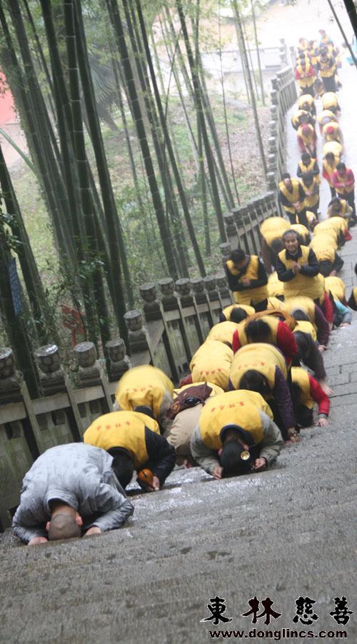 大家三步一拜,一声南无本师释迦牟尼佛。拜的是真诚、是感激,感恩佛菩萨的救度与教化,感恩师父的统领。虽然一路雨水,一路泥泞,但就因这泥泞升华了大家的信仰与道心。浩浩荡荡的队伍从塔下一直蜿蜒至上,都身着东林慈善的黄马甲,一旁的游客们也被这样的景象打动,纷纷恭敬合掌。