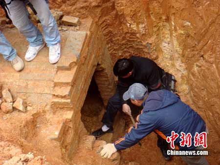 23日上午,随着古墓门被打开,挖掘清理工作正式开始,工作人员小心翼翼的用工具进行挖掘,随着墓室里的泥土被一筐筐清理出来,整个墓室完整的显露出来:这是一个高1.5米、长约3米的墓室,整体结构都是由砖块修砌而成。墓室内有一个用砖石砌成的棺台,棺台的四周整齐的修葺着四条排水道,因为年代久远,棺木及墓主人已经完全腐朽碳化成黑色粉末状混杂在泥土中,墓室内没有发现任何的陪葬物品及墓志铭。