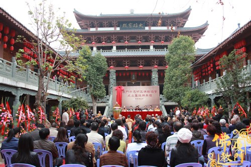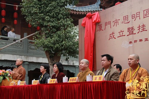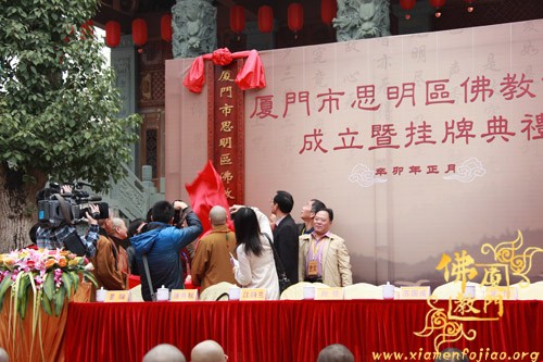 市、区领导和厦门市佛教界代表:则悟大和尚、江韵兰主席、陈秀枝部长、苏国成副局长、普端法师、定恒法师、黄诚局长、徐勇副局长、胜定法师、黄镇辉处长共同为思明区佛教协会揭牌,宣告区佛教协会正式成立。
