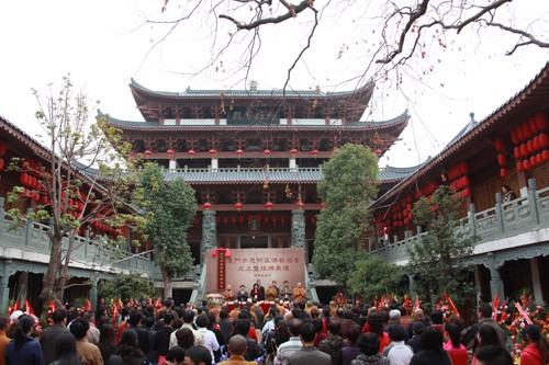 9点50分许,思明区佛教协会成立暨挂牌典礼在三宝歌中圆满结束,与会人员在天王殿前合影留念。